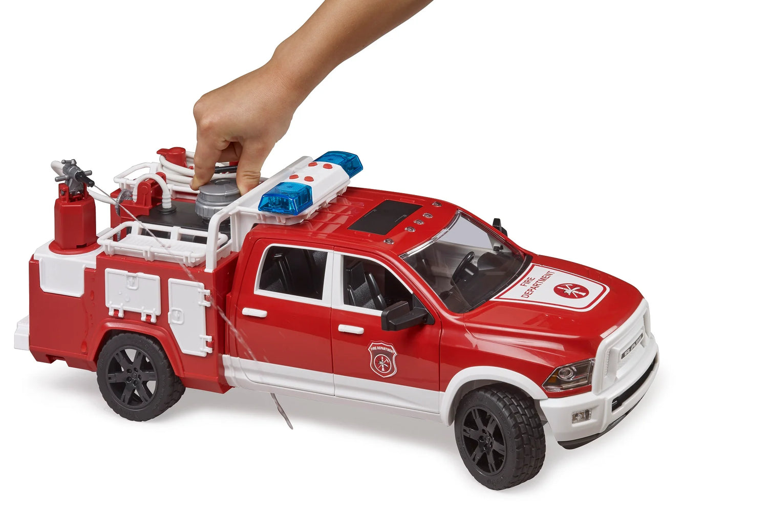 The Ram brand enjoys a high reputation, and not just in the leisure sector. This pick-up is also used as the basis for a variety of commercial vehicles, as this model was developed by Ram as a "Heavy Duty Pickup Truck". The Ram fire engine is the latest addition to the range of emergency vehicles. Thanks to its suspended axles and extended steering wheel, this fire engine is extremely capable off-road. The tank system with mounted water cannon allows it to reach hard-to-reach fire sites. A second hose can be connected to the water tank for additional fires. The necessary tools and fire extinguishers can be stored in the numerous compartments. This highly detailed vehicle also includes a light and sound module.