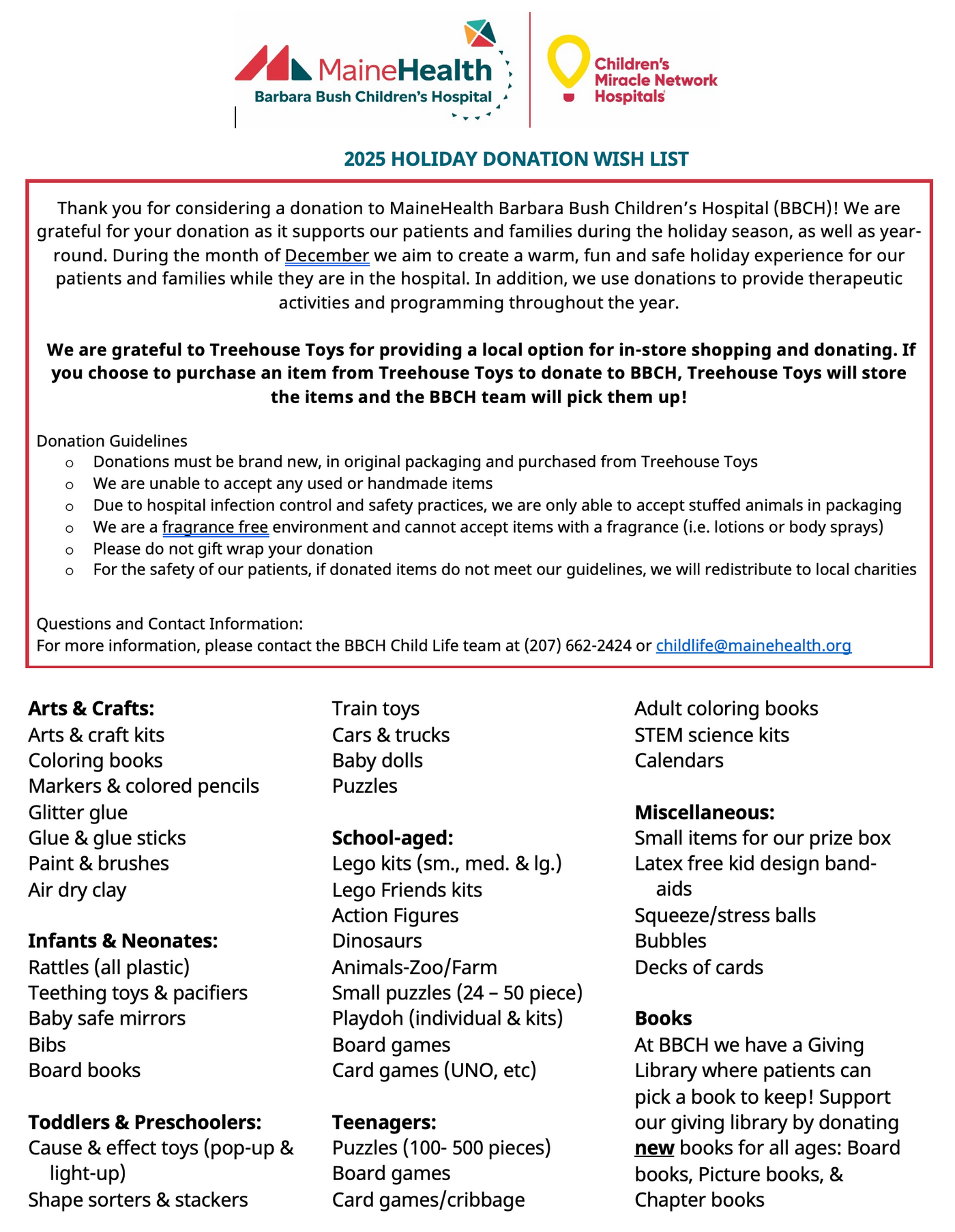 Below you will find the 2025 Holiday Donation Wish List- provided by BBCH. As well as a selection of collections for easy shopping.