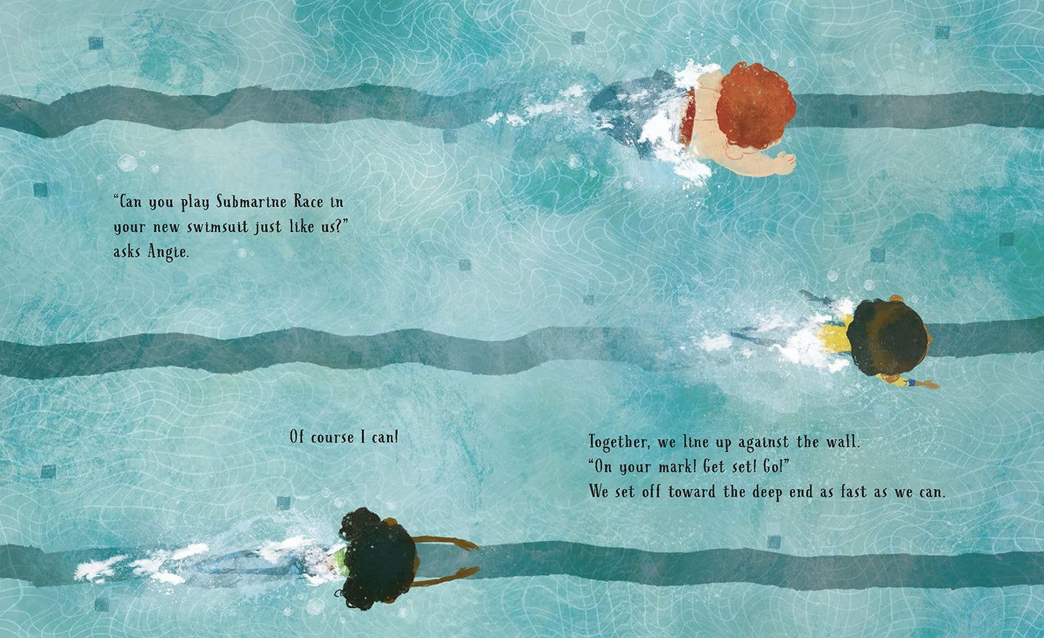Luckily Mama helps Heba to find strength in the mermaid girls who came before her. Feeling more connected to the women of her family, Heba is ready to show her friends that she can do all the same things that they can do—handstands, summersaults, and dives off the diving board—even while wearing her yellow burkini.