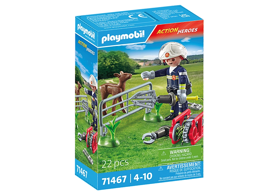 With the PLAYMOBIL set Firefighting Mission: Animal Rescue, every adventure becomes a wild and fun experience! A little fawn got caught in the fence, but the clever firefighter rushes to the rescue with his gear. With skilful rescue manoeuvres, he bends the fence and frees the frightened fawn. The hydraulic unit offers a choice between a rescue cutter and spreader, and the fawn can joyfully move its head. With removable glove attachments and a cool, movable visor helmet, every child becomes an animal-loving firefighter hero. This detailed PLAYMOBIL set not only stimulates creativity but also fosters a sense of responsibility – the ideal gift for aspiring rescuers aged 4 and up!