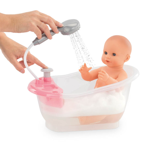 The bathtub and shower requires no batteries and is part of the Mon Grand Poupon Corolle Collection of dolls, fashions and accessories to help little ones take care of their baby doll the way their parents take care of them.