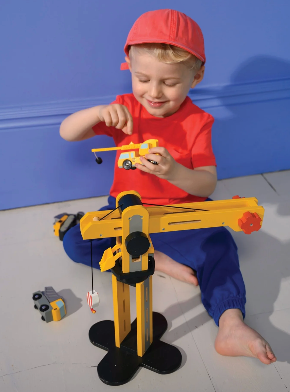 Get ready to reach new heights with our Big Yellow Crane, the ultimate wooden wonder for little engineers-in-training! With its bold yellow arm reaching up, down, forward, and back, kids can ‘hook’ into hours of imaginative play. The crane’s rotating turntable puts control right in their hands, letting them spin, hoist, and swing like a pro! Can your little one load the construction vehicles on the platform?