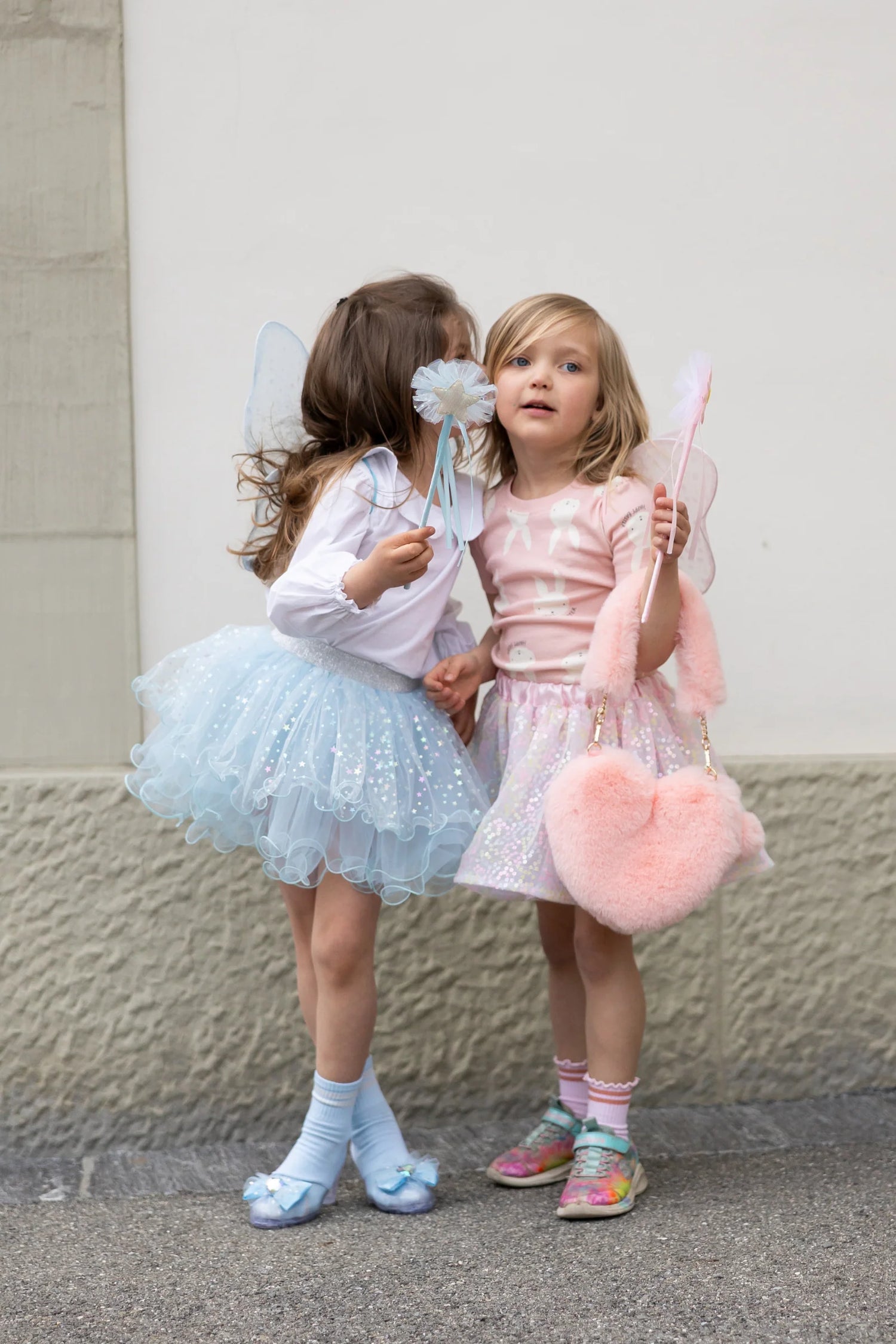 Sprinkle a little stardust on every step with the Iridescent Celestial Fairy Wings, tutu and wand – a dreamy trio made for magical moments. This enchanting dress-up set includes a layered light blue tutu adorned with twinkling silver stars, perfect for swirling and twirling through playtime adventures.