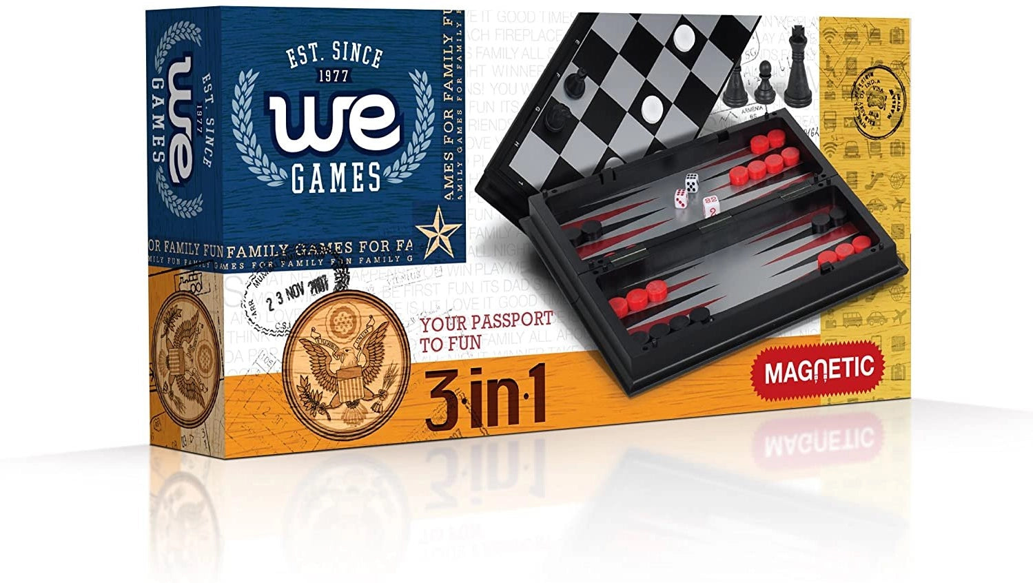 Take this chess, checkers and backgammon set on a plane, train or automobile. Here is a magnetic travel game set that really works. The board lays flat and the pieces stick to the board. The durable plastic board includes algebraic notation on all sides, making it a great learning tool for players at all levels. The pieces store inside the folded board when not in use. The magnets hold strong to the board which helps during travel. Whether you are walking to the park, backpacking across Europe or traveling to a chess tournament, this portable set is treasured by chess enthusiasts across the world for its compact size.