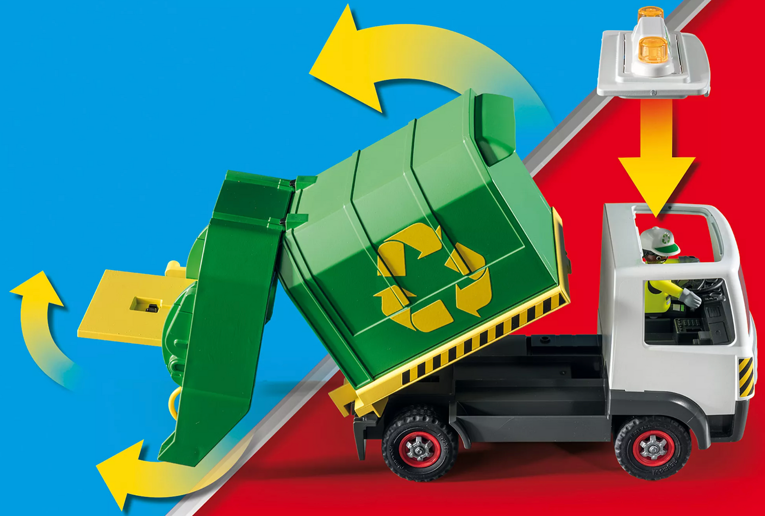 Help keep the city clean with the PLAYMOBIL Recycling Truck. This PLAYMOBIL City Life Recycling Truck comes with many realistic features, such as two bins and lots of garbage to collect and recycle. Help the sanitation workers to load the bins on the back of the truck and then pull the lever to lift and empty each container. To empty the vehicle, the entire container is tilted up and the rear attachment is lifted. Easily access the driver's cab thanks to the removable roof. Two members of the sanitation department can ride in the vehicle. Just like the real thing: The figures can stand on the left and right at the rear of the vehicle, holding on to the grab handle while driving.