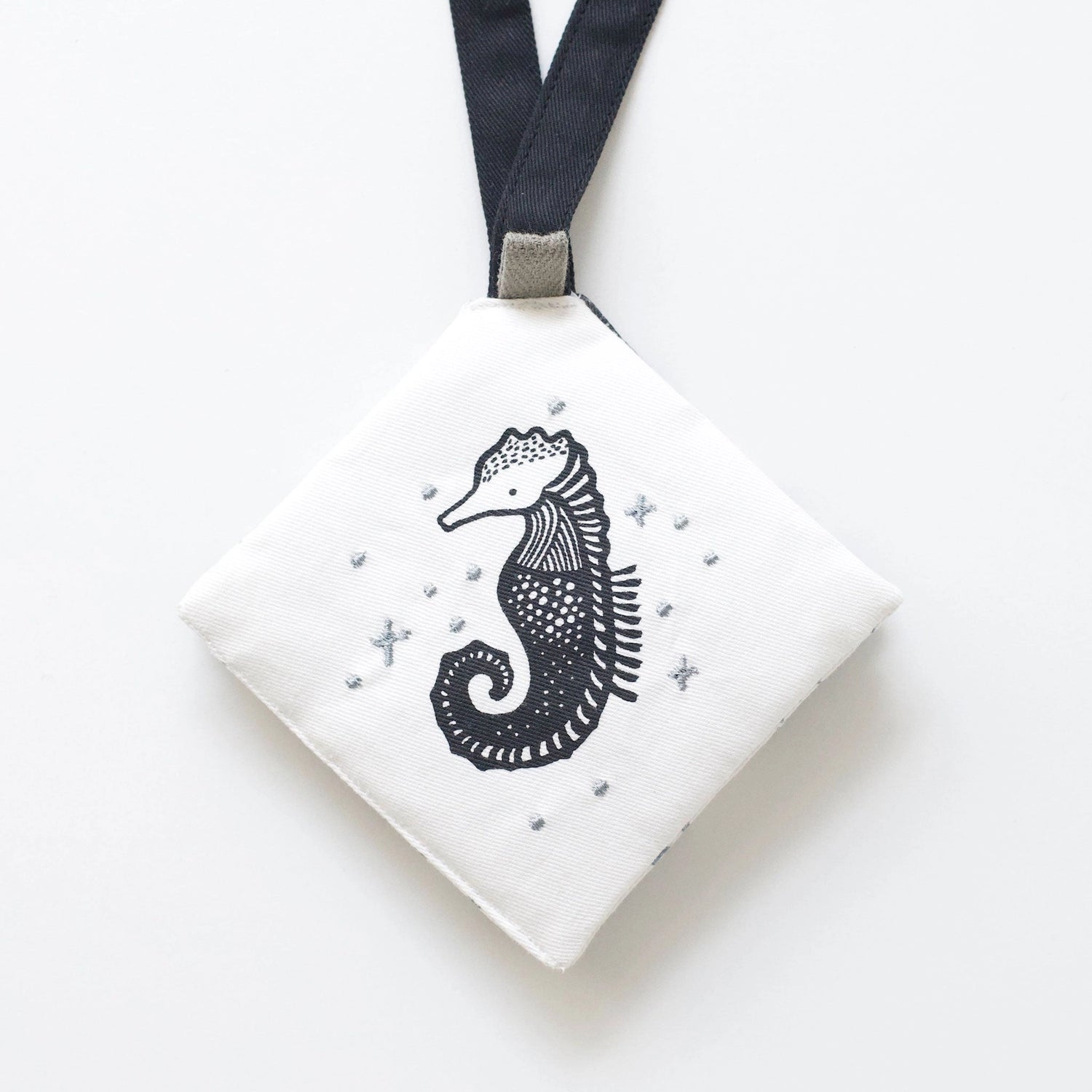 Encourage baby to observe the natural world with this ocean themed Crinkle Pages toy that attaches to stroller, car seat, diaper bag, or play gym. Spot animals that can be found in the ocean — a seahorse, turtle, sea star, octopus, and puffer fish that adorn the crinkly pages in our high contrast style. Each of the stimulating embroidered pages and mirror make this stroller toy super engaging for your little one. And with the stylish velcro strap it won't get lost while you're on the go. Easy to take on a trip and keep with you wherever you travel. Screen printed for quality with nontoxic ink on soft organic cotton twill, they are ideal for little hands that love to explore. A wonderful gift for babies, Easter basket, spring treat, baby shower and more. Measures 4 inches by 4 inches. Made of: 100% Organic Cotton Canvas, Crinkle Paper and Plastic Mirror