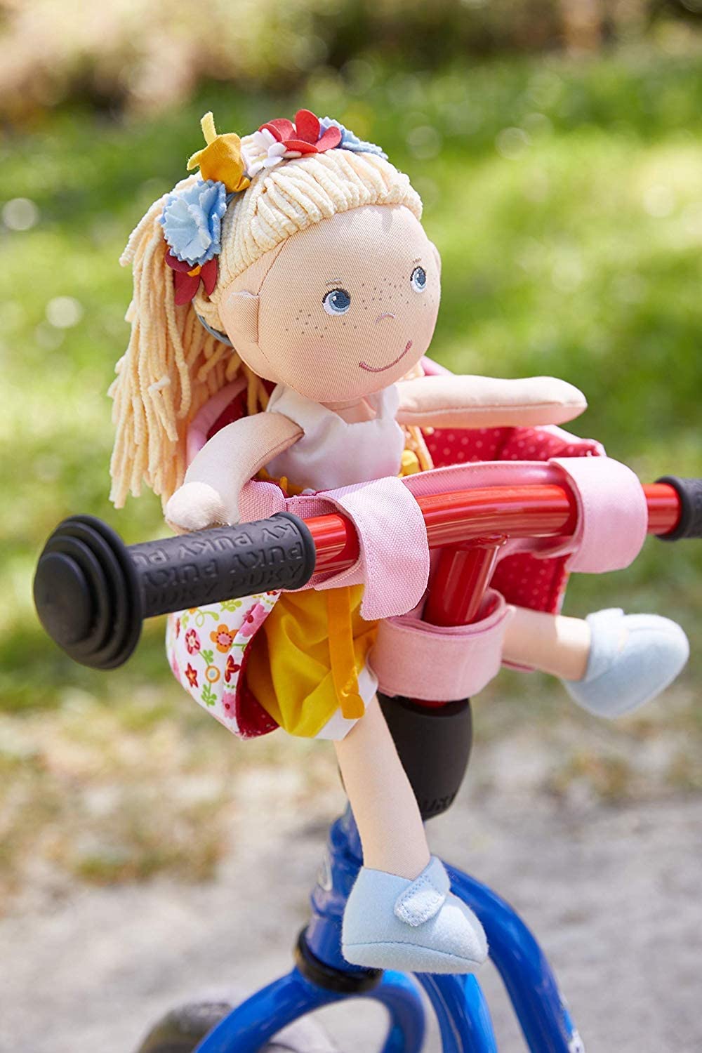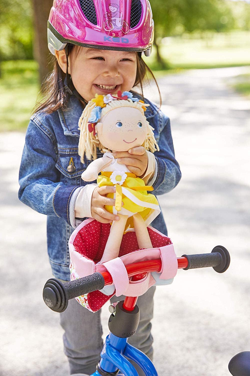 Children will love to bring their favorite dolls on a bike ride! Washable floral fabric seat that easily and securely attaches to bicycle handlebars and will hold any HABA doll. It can also be attached to a push bike, scooter or a sled in the winter.