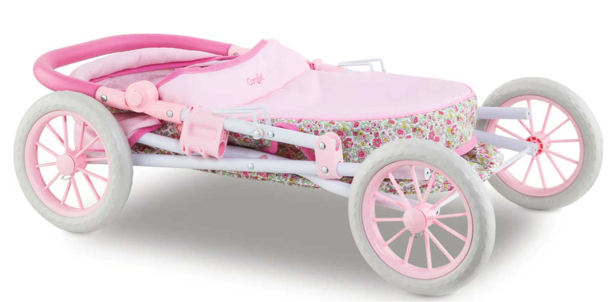 It's time for a walk and Kids will love taking their favorite 14" - 20" baby doll for a stroll in style. Its handle height is adjustable from 14" to 29.5" to accommodate children as they grow. It has an adjustable hood, a storage basket for baby's things, a removable bassinet cover and comes complete with a matching nursery bag. When playtime is over, the carriage folds easily for space-efficient storage. It's part of the Mon Grand Poupon Corolle Collection of dolls, fashions and accessories to help little ones take care of their baby doll the way their parents take care of them.