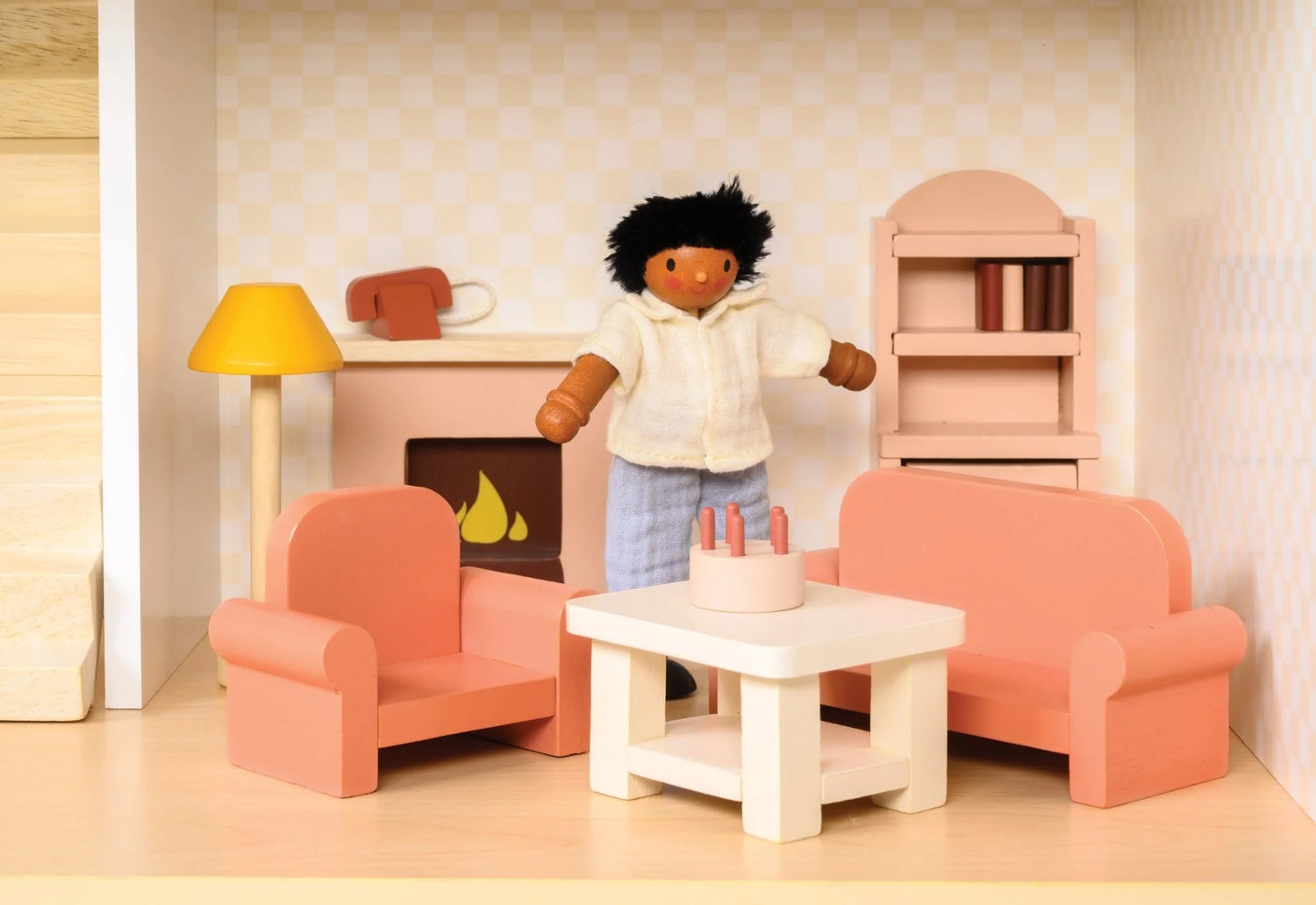 This Doll House Sitting Room furniture set includes a sofa, a telephone, an armchair, a coffee table, a standard lamp, a fireplace, and a bookcase with 5 books and 2 drawers. It also comes with a knitted fabric throw for the sofa! These wooden pieces are the perfect size for your Mentari dolls (sold separately), or other dolls measuring 4" - 5" tall. For ages 3 and up.