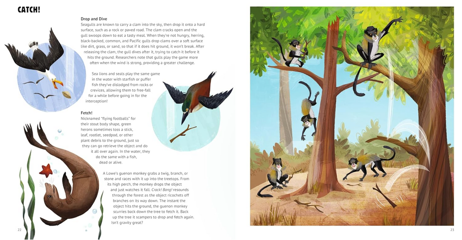 Step into the fascinating world of animal playtime to find penguins surfing for the joy of it, primates playing peekaboo, and sneaky keas—the pranksters of the bird world—yanking one another’s legs just for kicks. Creatures of all stripes like to play! Some play builds strength and teaches survival skills: a game of tug-of-war prepares wolf cubs for hunting and taking down prey, while games of hide-and-seek give mongooses practice at quick escapes, handy for outmaneuvering predators.