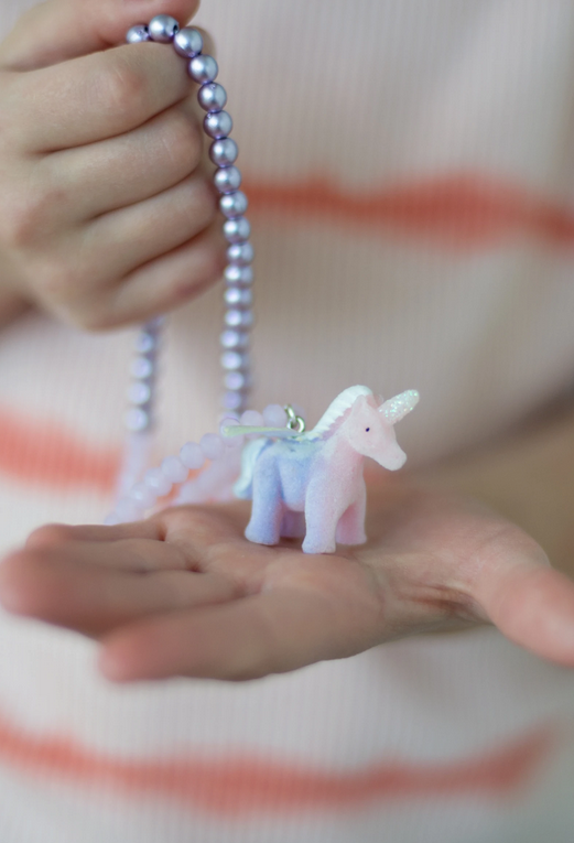 Show off your love of unicorns with this fancy unicorn necklace! It features a section of iridescent purple beads, dreamy translucent pink beads, and a pink & purple unicorn pendant! The unicorn is lovely, with a soft texture, a sparkly horn, shiny wings, and a white mane and tail. It's the perfect gift for fans of unicorns and dress up!