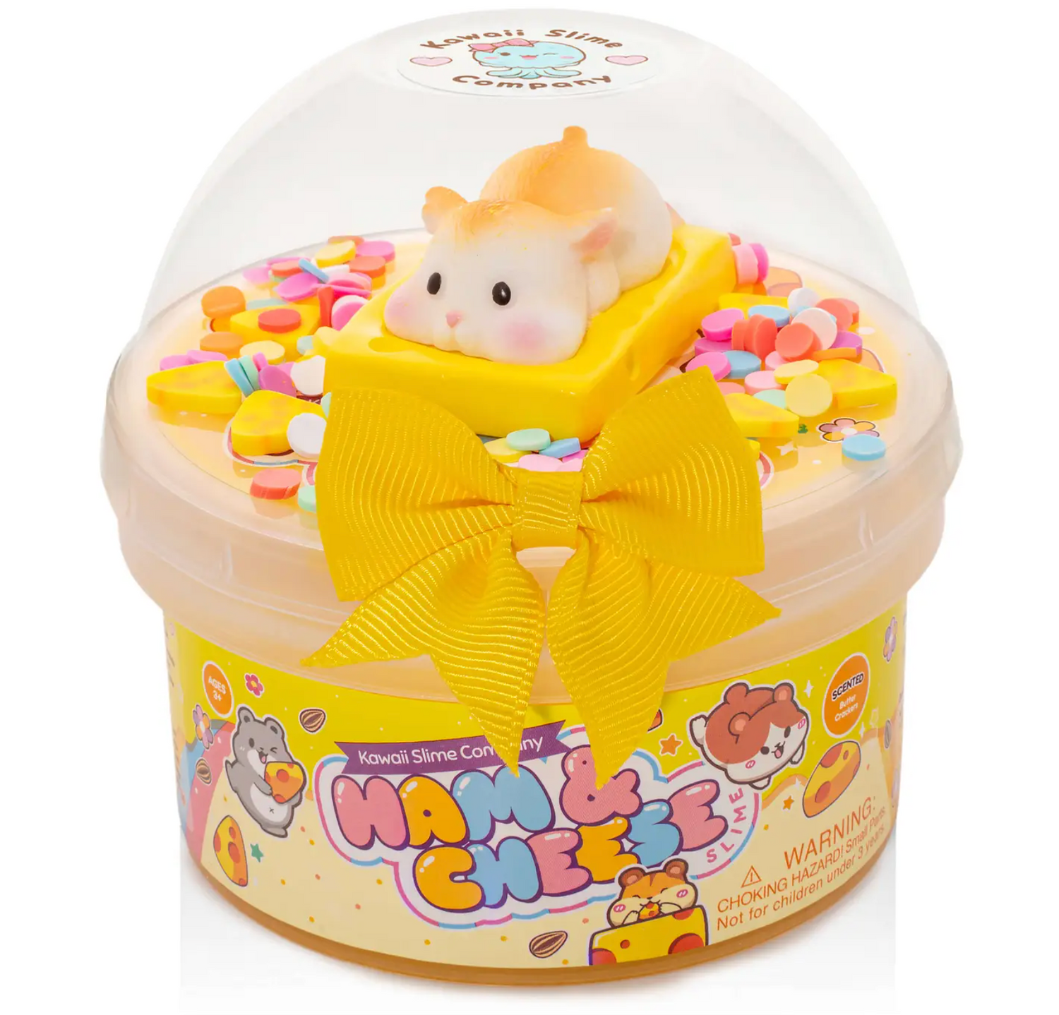 Say cheese!  Meet Ham & Cheese Butter Slime the ultimate snack-inspired slime adventure! This vibrant yellow glossy slime is smooth, stretchy, and smells just like buttery crackers savory, cozy, and totally squish-worthy! ✨Each slime comes with an adorable hamster on a cheese charm and a playful mix of cheesy fimo sprinkles to make your slime time extra fun and snack-tastically cute. Stretch, swirl, and savor the squeaky fun of Ham & Cheese no crumbs, just giggles!