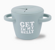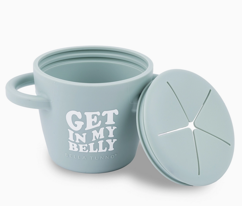 The Happy Snacker is a first-of-its-kind two-piece silicone snack cup with a mess-proof snap-tight lid and soft silicone opening so little hands can easily access food and prevent spills. Designed with easy-grip handles, it fits in car seats and stroller cup holders.