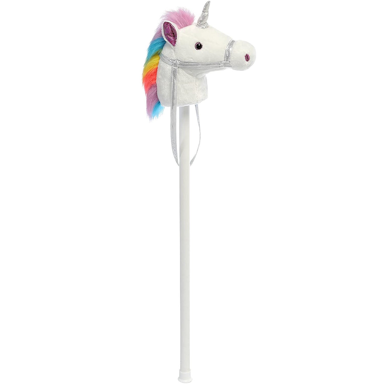 Aurora World's White Unicorn Giddy-Up Stick measures 37" and makes a whinny and gallop sound as each ear is squeezed. Rainbow mane and Silver bridle. Top quality materials are used to ensure durability and the wooden stick has a cap on the end for safety. Aurora World is an industry leader with over 30 years of experience designing and manufacturing innovative, high quality plush products. Ages 3 and up.