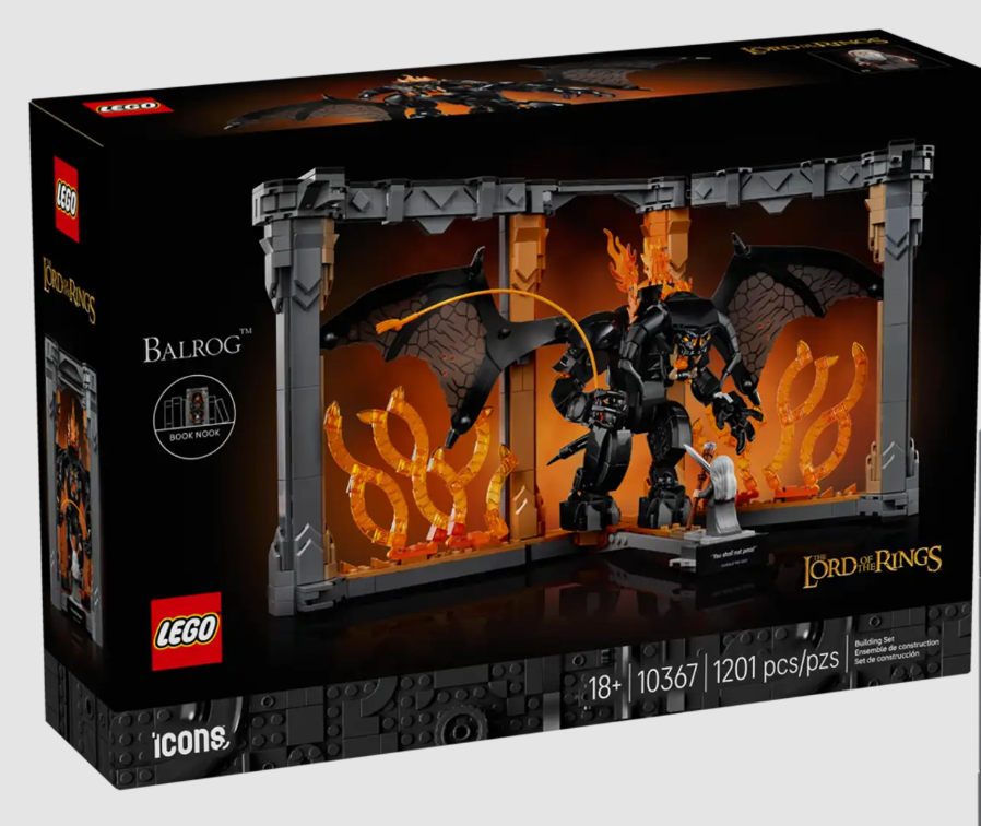 Bearing a plaque with the words ‘You Shall Not Pass’, the model depicts Gandalf the Grey™ in a fearless stance and the Balrog with its mighty wings unfurled against a blazing wall of flames. Both characters are detachable and the Gandalf minifigure has a staff and sword, while the Balrog figure wields a fiery whip and features posable limbs and wings for dynamic display.