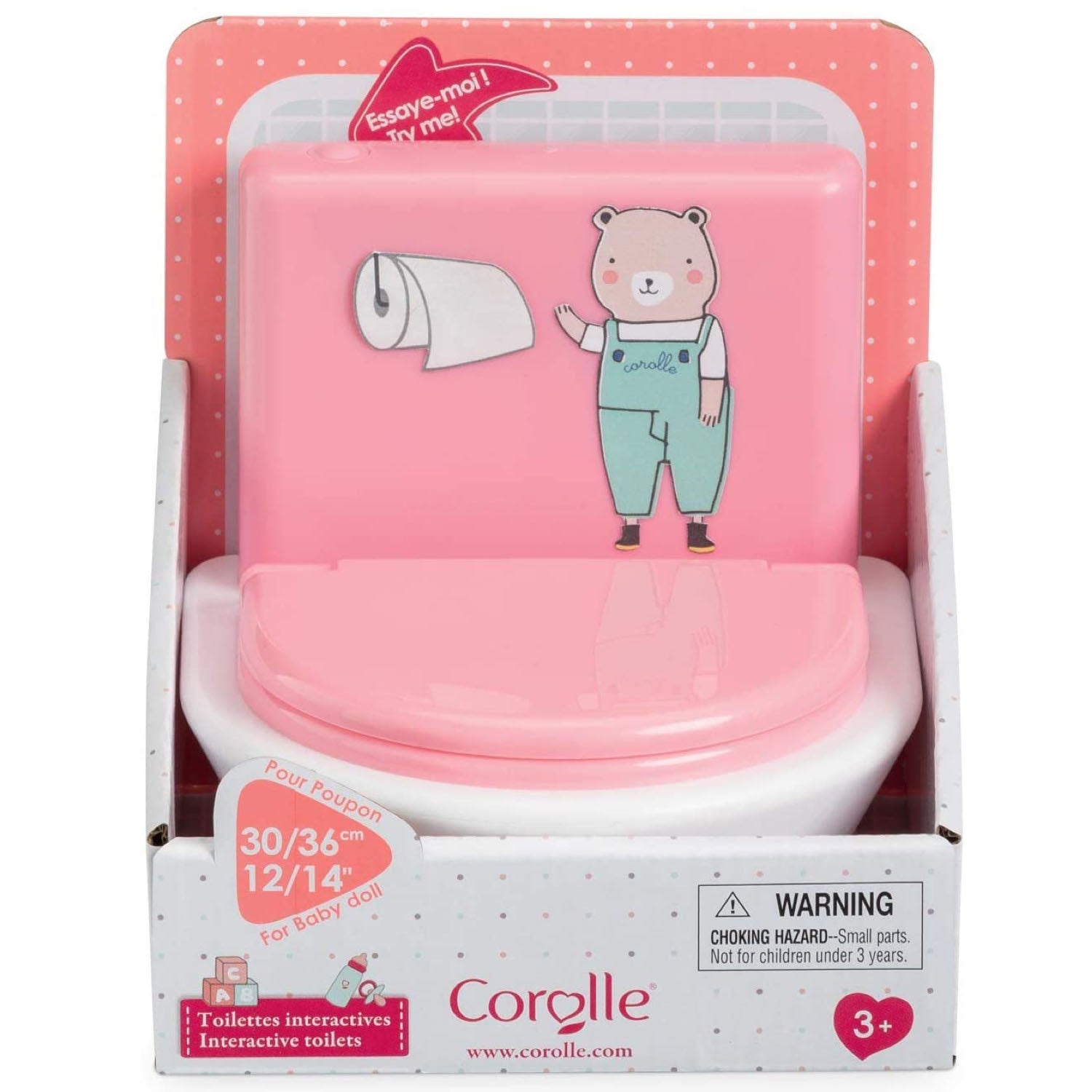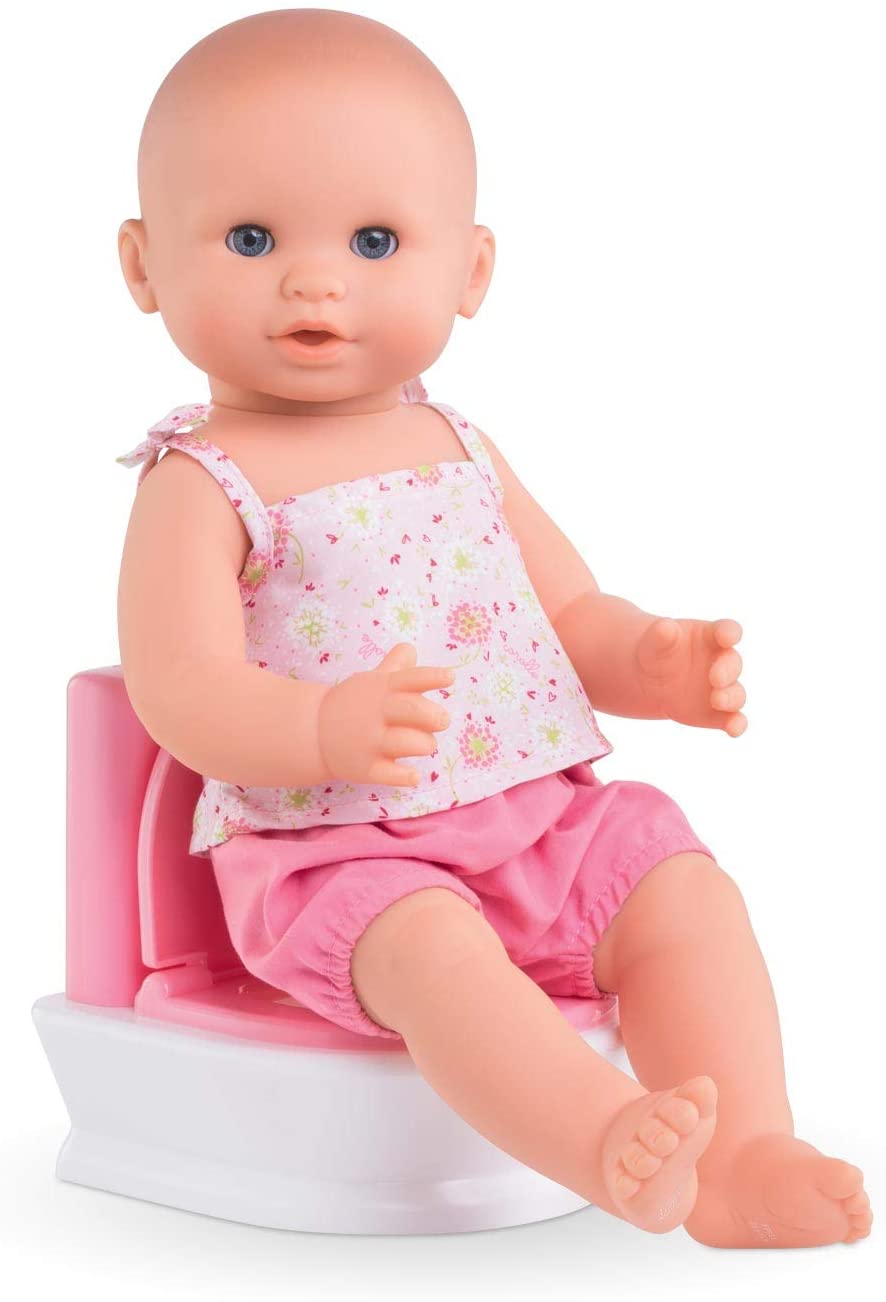 When it's time for baby doll to stop wearing diapers, it's time to learn how to use the toilet and this interactive one is ideal for the task. The lid opens and closes and the flush button activates two sounds -- that of baby doll going on the potty and of water flushing. Requires 3 AG13(LR44) batteries (included). it's part of the Mon grand poupon Corolle collection of dolls, fashions and accessories to help little ones take care of their baby doll the way their parents take care of them. Ages 3 years and up