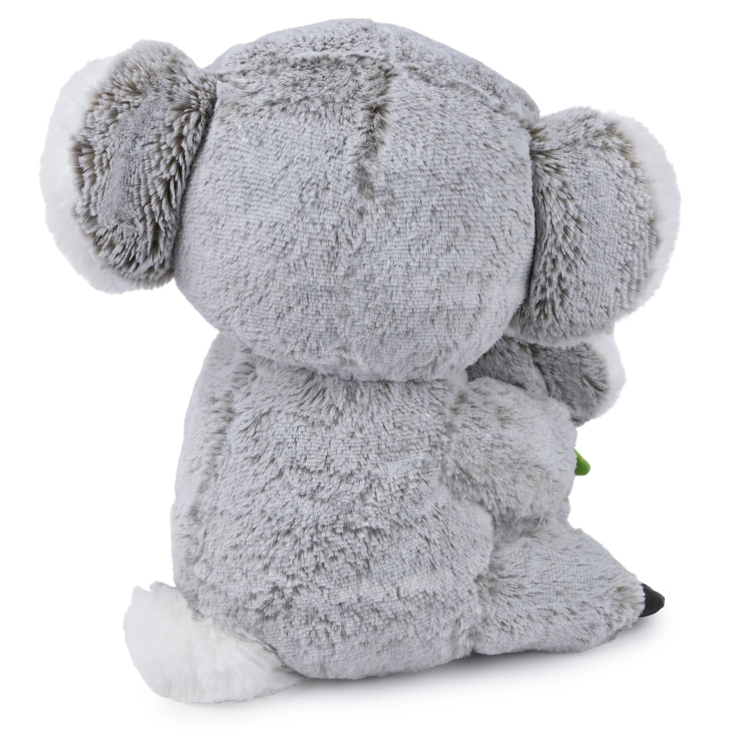 Zozo is a beautifully crafted parent koala bear measure 10 inches, with a classic, eye-catching design. This impressive plush features Zozo in a seated position, tenderly cradling their cub. The baby koala even holds a few green felt eucalyptus leave as a snack for later! Both cuddly koalas feature soft gray plush fur, a plump, pillowy feel when squeezed, and premium faux-suede nose and claw details. This seated parent-baby duo is perfect for complementing collections and modern décor of all kinds with a whimsical touch! Surface washable for easy, convenient cleaning and lasting softness. Appropriate for ages 1 and up.