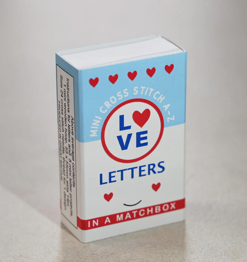 A complete cross stitch kit with everything you need all packed into a tiny matchbox.