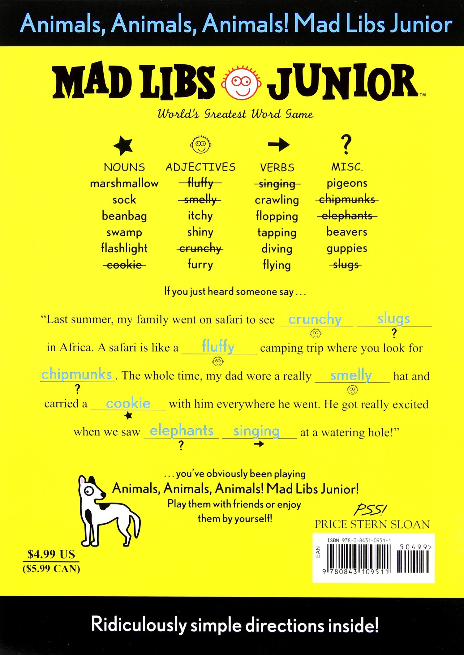 The idea is simple. Someone asks for a part of speech: a verb, a noun, an adjective, or an adverb. We've included definitions and examples of the parts of speech in case you've forgotten. Players call out their ideas to fill in the blanks and in the end, you have a story reeling from one silly sentence to another until nothing makes sense. That's what you call a Mad Lib®, the world's greatest word game. Players have been howling with friends or laughing all to themselves for over 35 years! Jr version made simpler for younger kids!