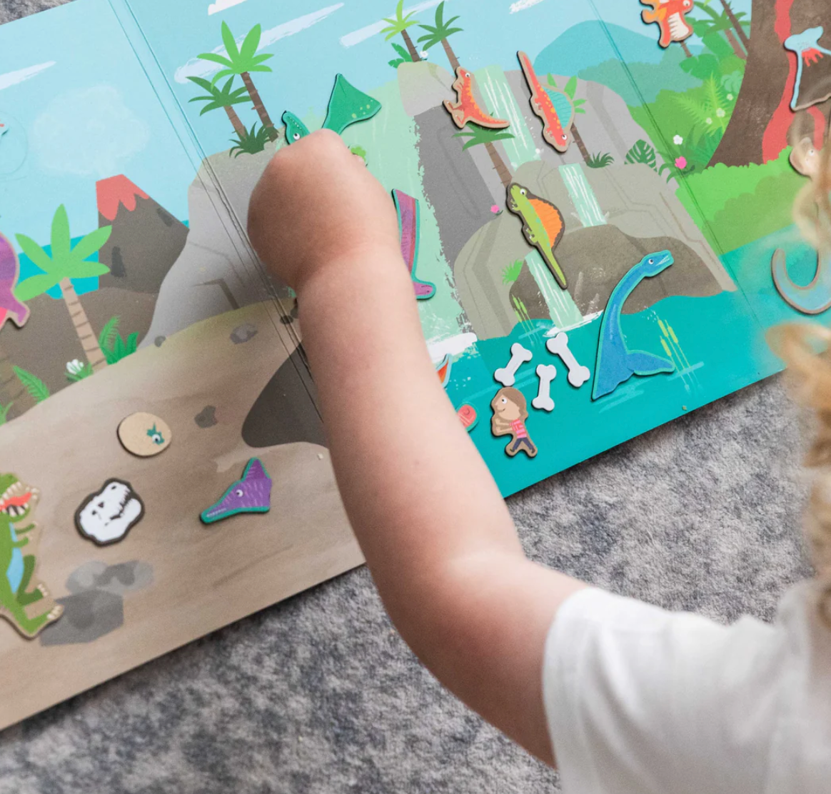 Dino World takes you back in time and on a big adventure through the jurassic world. Ride the waterfall, explore the erupting volcano, take care of a Dino egg! Loads of prehistoric characters to play with including a baby triceratops, a swimming plesiosaur and even a follis or two! Create a new scene every time you play. Then when you are finished, pack up is super fun with the ‘match the magnet pieces’ puzzle on the case! Job done.