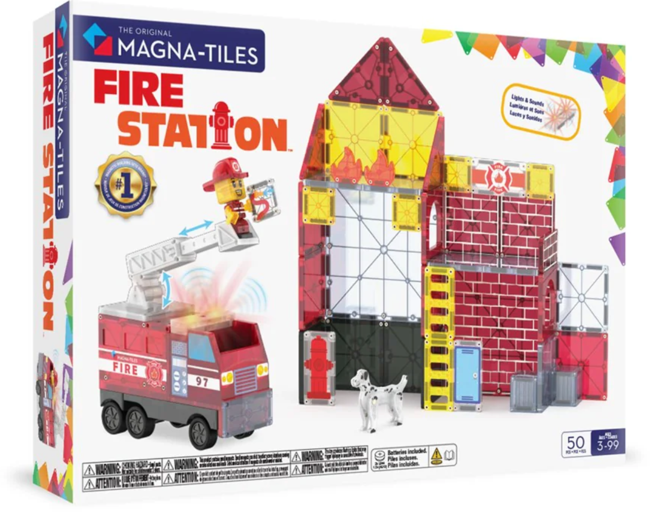 Step into action with the MAGNA-TILES Fire Station 50-Piece Set! Create custom rescue vehicles with the all-new modular Fire Truck, complete with an extendable ladder to tackle towering blazes. Bring playtime to life with the Light & Sound Tile, featuring flashing lights and a siren for an authentic firefighting experience. Complete with a Firefighter Figure and their trusty magnetic Dalmatian companion. use the easy-to-use microMAGS Cubes, attachable Fire Tiles and functional Ladders and Fence to create dramatic, fun-filled rescue operations. The Fire Station Set sparks imaginative play, making every child the hero of their MAGNA-TILES world! Pair it with the MAGNA-TILES Police Station to complete your city and create a world of teamwork and adventure!