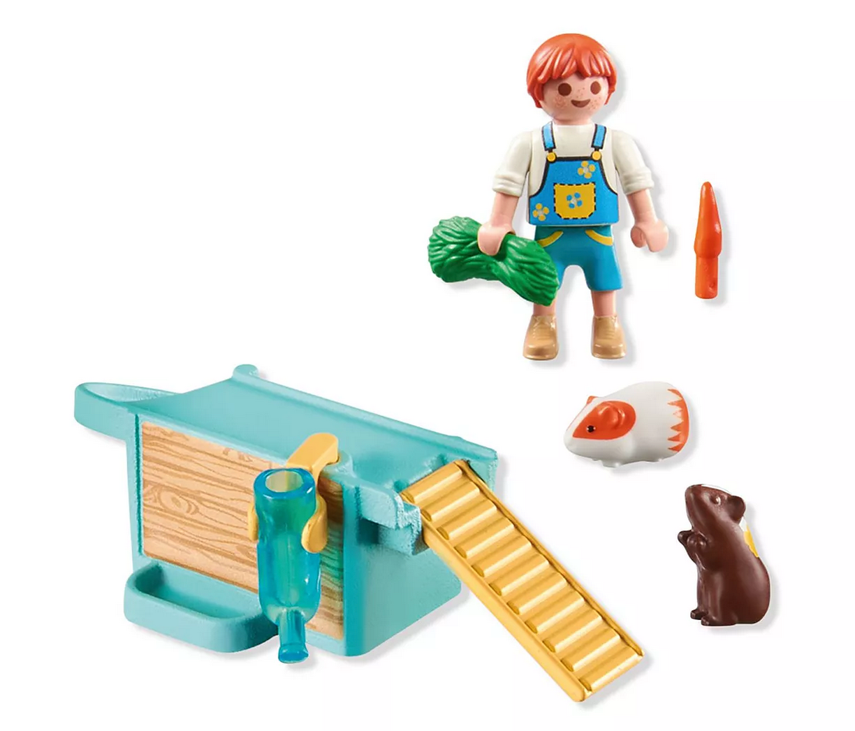 Meet the caring boy who looks after his two playful guinea pigs. At the PLAYMOBIL Guinea Pig House, each furry friend scurries across a staircase, sips water from the bottle, and nibbles carrot slices. The cozy hideaway encourages plenty of exploration, fostering imaginative play. With thoughtful details like tufts of grass for snacking, kids can design unique pet adventures. Invite compassion and creativity into every moment with this cute set.