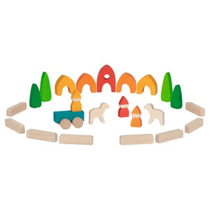 Crafted from select wood qualities and adorned with harmoniously coordinated colors, this set ignites creative play and imagination. A perfect blend of Montessori and Waldorf philosophies. In true Montessori fashion, these building blocks encourage hands-on exploration and problem-solving. Children can construct and reconstruct their miniature village, developing spatial awareness and fine motor skills. The open-ended nature of the toy allows for endless architectural possibilities, fostering independence and confidence. Aligning with Waldorf principles, the vibrant colors enhance the natural wood grain rather than concealing it, maintaining a connection to nature. This sensory-rich experience stimulates a child's aesthetic sense and appreciation for natural materials. Handcrafted with European craftsmanship, each piece is a testament to quality and durability. As children build their own little world, they engage in imaginative play, storytelling, and social-emotional development.