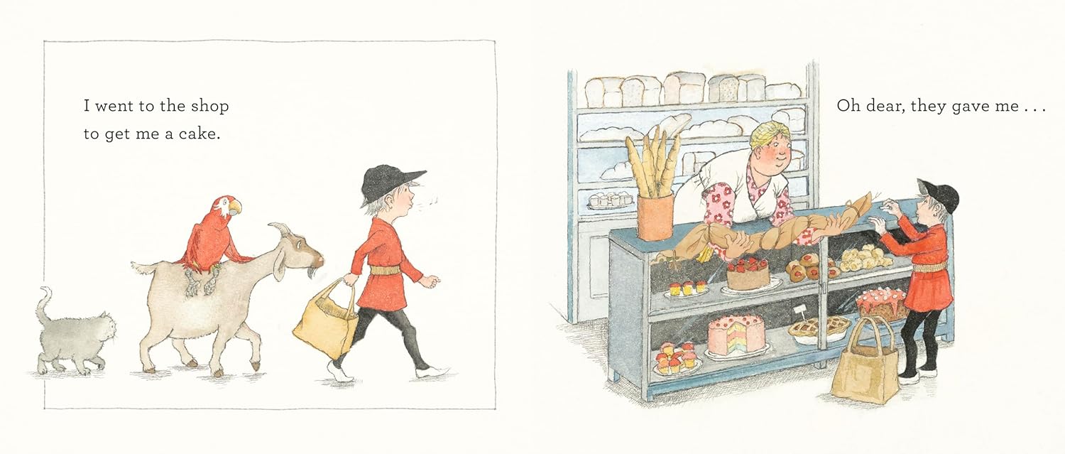 As a hapless boy goes from shop to shop, requesting a series of perfectly reasonable items—a hat, a coat, a cake, a chair—he finds himself thwarted at every turn, amassing instead a growing menagerie of animals who happily follow him on his errands. It’s not until he finally asks for a cup that he’s proffered a wriggly creature that solves his dilemma . . . or does it? Adding delicious momentum to Michael Rosen’s rhymes (and mastery of the page turn) are an expressive crew of animal characters rendered as only Helen Oxenbury can, making for a timeless story guaranteed to beg many repeat readings. Oh dear!