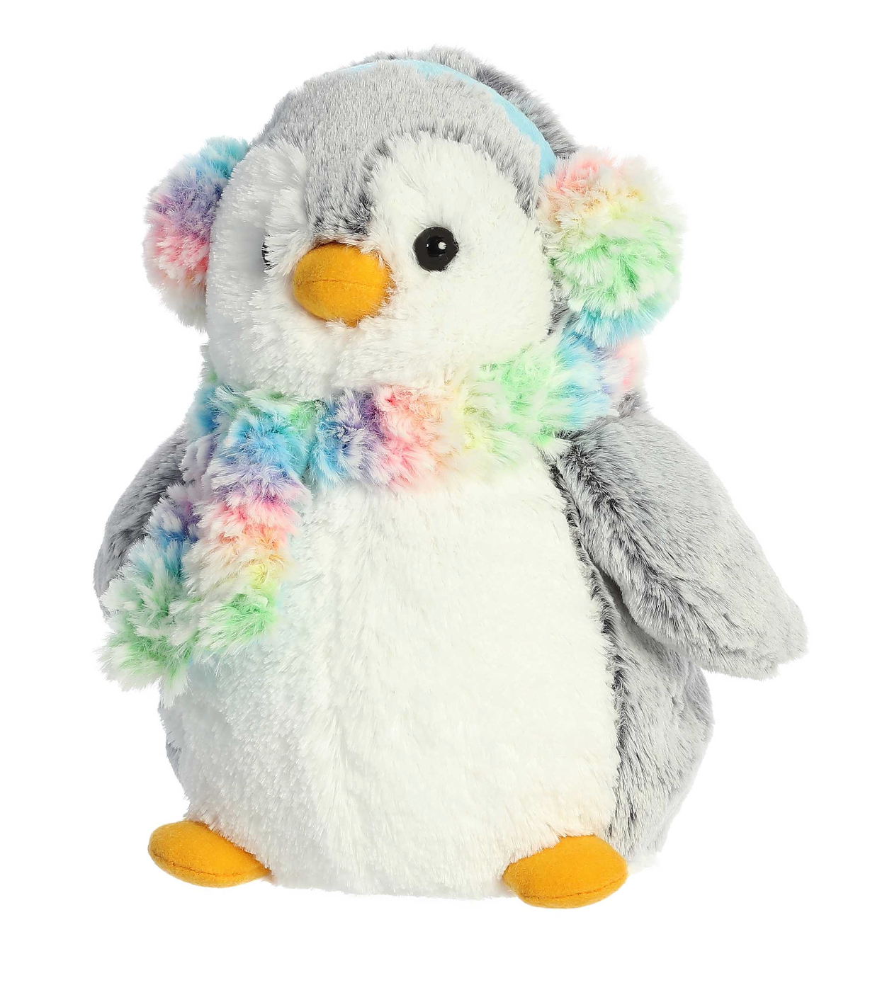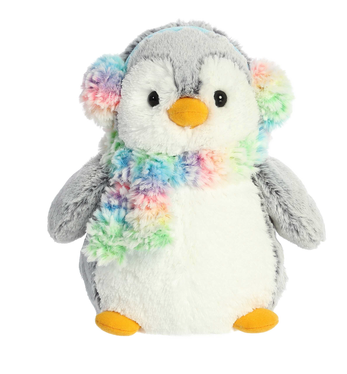 Dressed in a colorful, fluffy scarf, this plush penguin captures the essence of winter fun with a touch of whimsy.