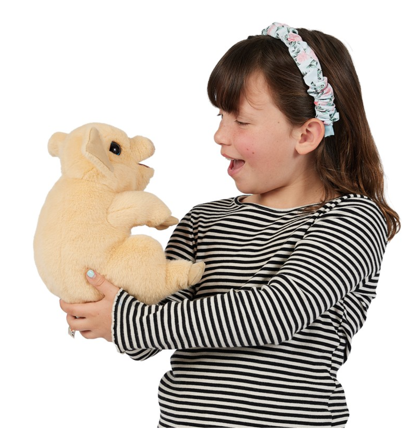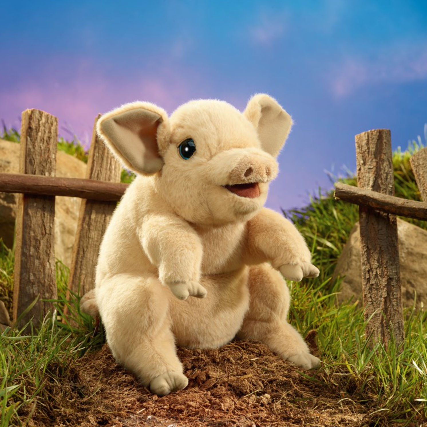 Fresh from the farm trots the Piggy puppet ready for sweet shenanigans. With movable mouth and forelegs, this cute little porker is perfect for barnyard tales and swine-y singsongs. 10" tall.