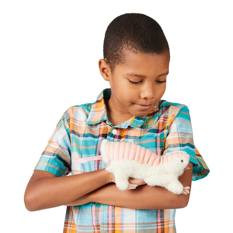 Hold an enigma in your hand with the Pink Fairy Armadillo puppet. Rarely seen in the wilds of Argentina, this diminutive and most elusive subterranean species is both mysterious and magical. Strangely adorable with an ivory white plush body and rosy hued flexible printed velour shell, this fascinating puppet is a three-finger design that will spark natural curiosity and burrow into your heart.