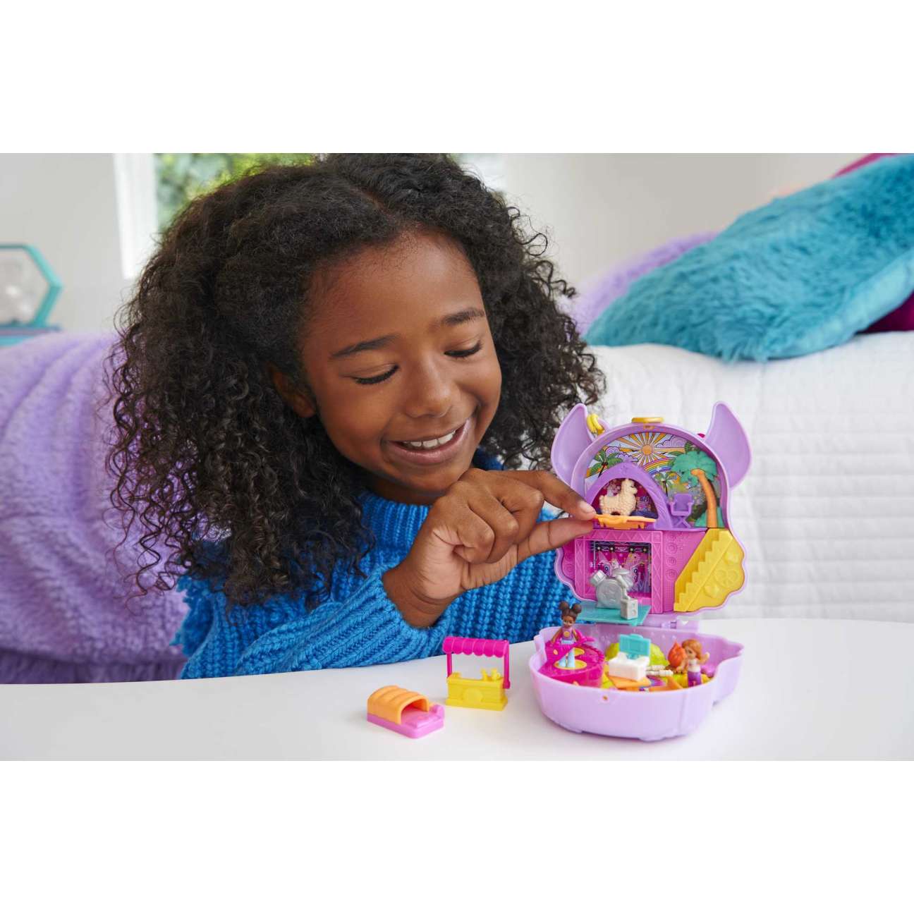 This Polly Pocket™ Camp Adventure™ Llama Compact features an adorable llama face exterior with a wristlet strap and fun-to-touch flower crown for endless fun! Open to reveal two micro dolls, five moving features and 13 accessories, some that Pop and Swap™.