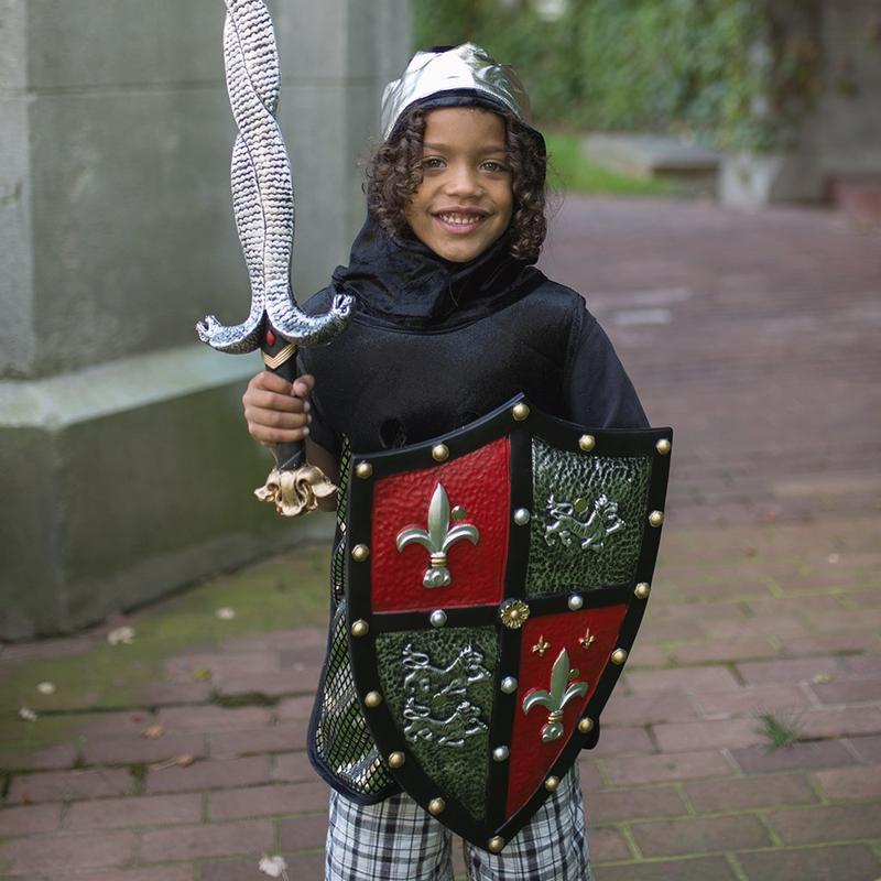 Every knight needs the perfect shield to help in warding off mystical beasts. This shield features a bold red and gold pattern with lion accents and fleur de leaf patterns, perfect for pairing with your favorite sword and suit of armor. Made from flexible textured foam and hand painted with a distressed look, this shield is oversized to defend the glory of the kingdom. Ages 3 and up.