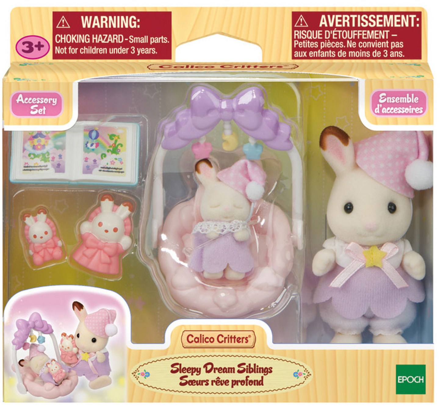 Get ready for bedtime with the Sleepy Dream Siblings Calico Critters Set! These adorable Chocolate Rabbit come dressed in nightgowns and sleeping caps, with the baby featuring a design where her eyes are closed—she’s already fast asleep! Also included in this set is a baby gym with a mobile for the baby to sleep in, a plush toy, an animal puppet that fits on the girl’s hand, and a bedtime story that the girl can read to the baby.