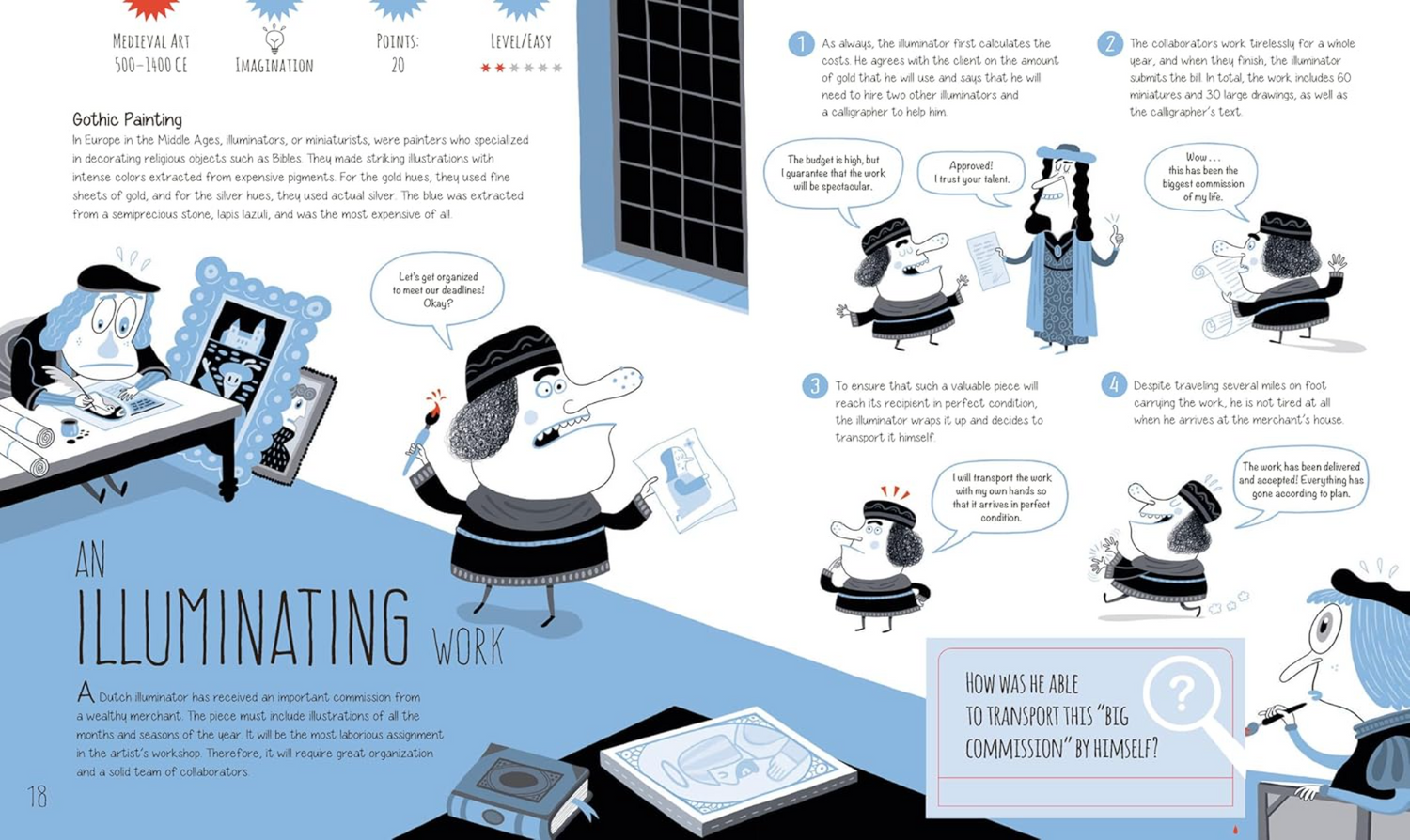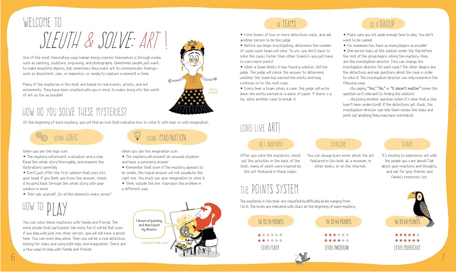 In Sleuth & Solve: Art, 20+ mind-bending mysteries are inspired by a wide range of art periods and styles, from prehistoric art to Impressionism, Expressionism, Cubism, Surrealism, and more. Clues are embedded in every detail, and unexpected twists put your wits to the test! Bonus activities allow readers to create their own art, too.