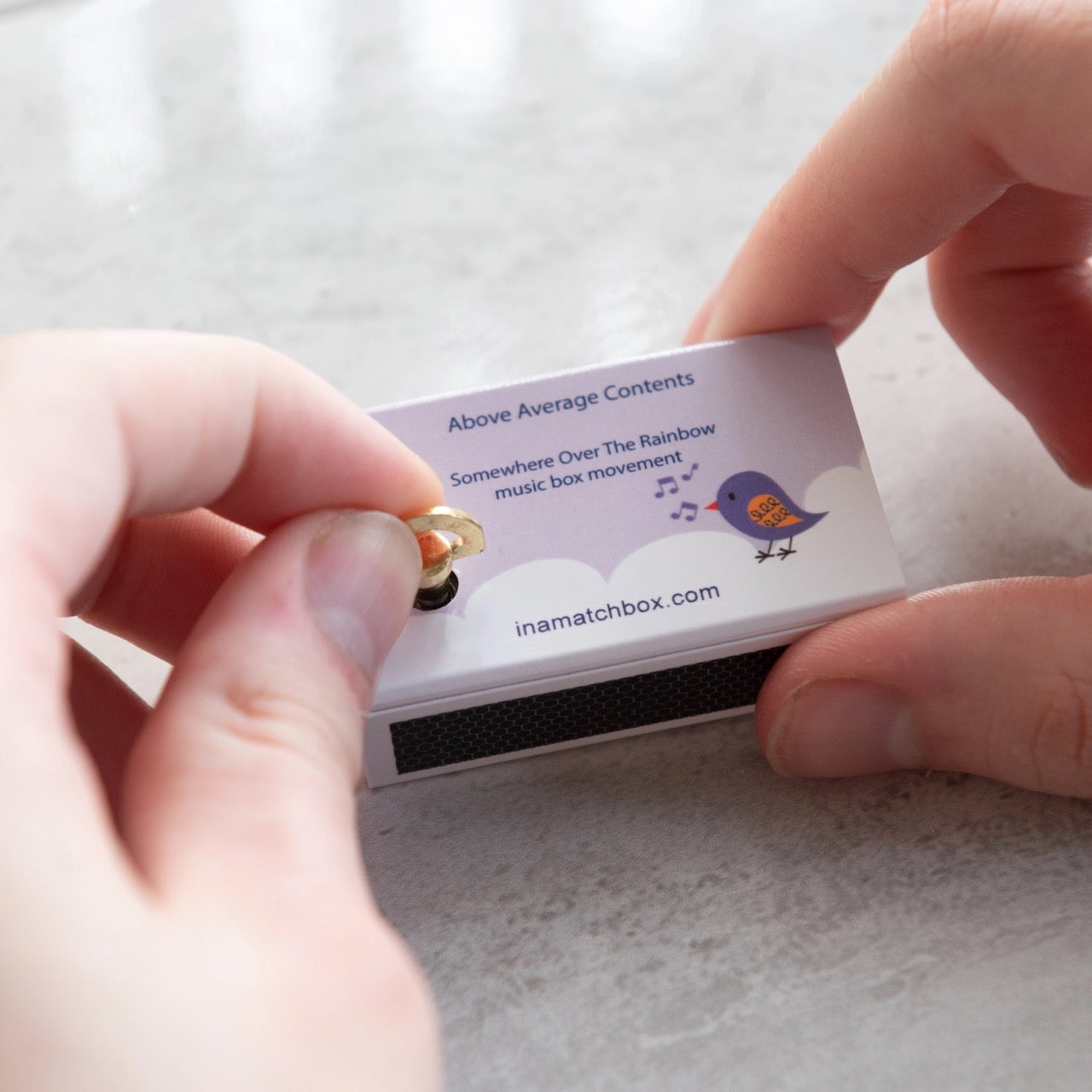 This magical gift with the inspirational message ‘Follow Your Dreams’, is perfect for a loved one starting university, moving job or following a life ambition. This beautiful gift transforms a matchbox into a fully functioning music box which plays the uplifting tune ‘Somewhere Over The Rainbow’. Included in this gift is a miniature music box movement, winder key and simple instructions. Follow Your Dreams In A Matchbox is sure to delight the young and young at heart. This matchbox will fit through a standard letterbox. Requires adult supervision. This is not a toy.