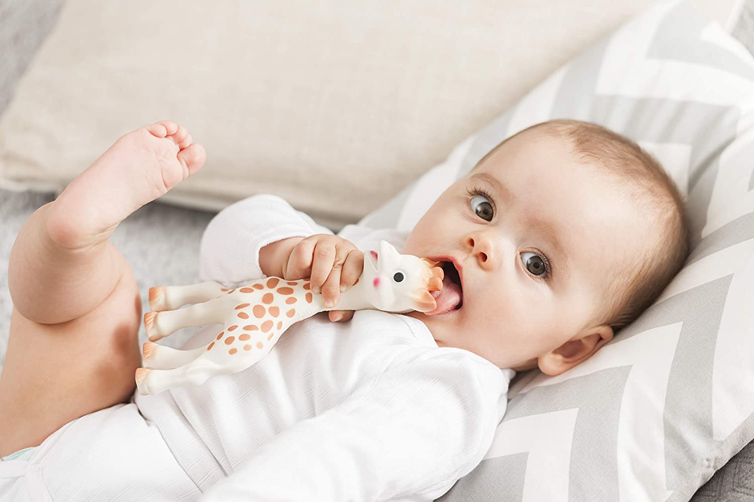 Sophie the Giraffe captivates babies by engaging all five senses! This playful French-made companion features a squeaky body that delights little ears, while its 100% natural rubber texture feels comfortingly like mom's skin. The distinctive Hevea tree scent makes Sophie instantly recognizable to your little one. At 7.1 inches, this adorable giraffe is perfectly sized for tiny hands to grasp and explore. Safe for chewing with food-grade paint, Sophie is the ideal first friend for your curious baby!