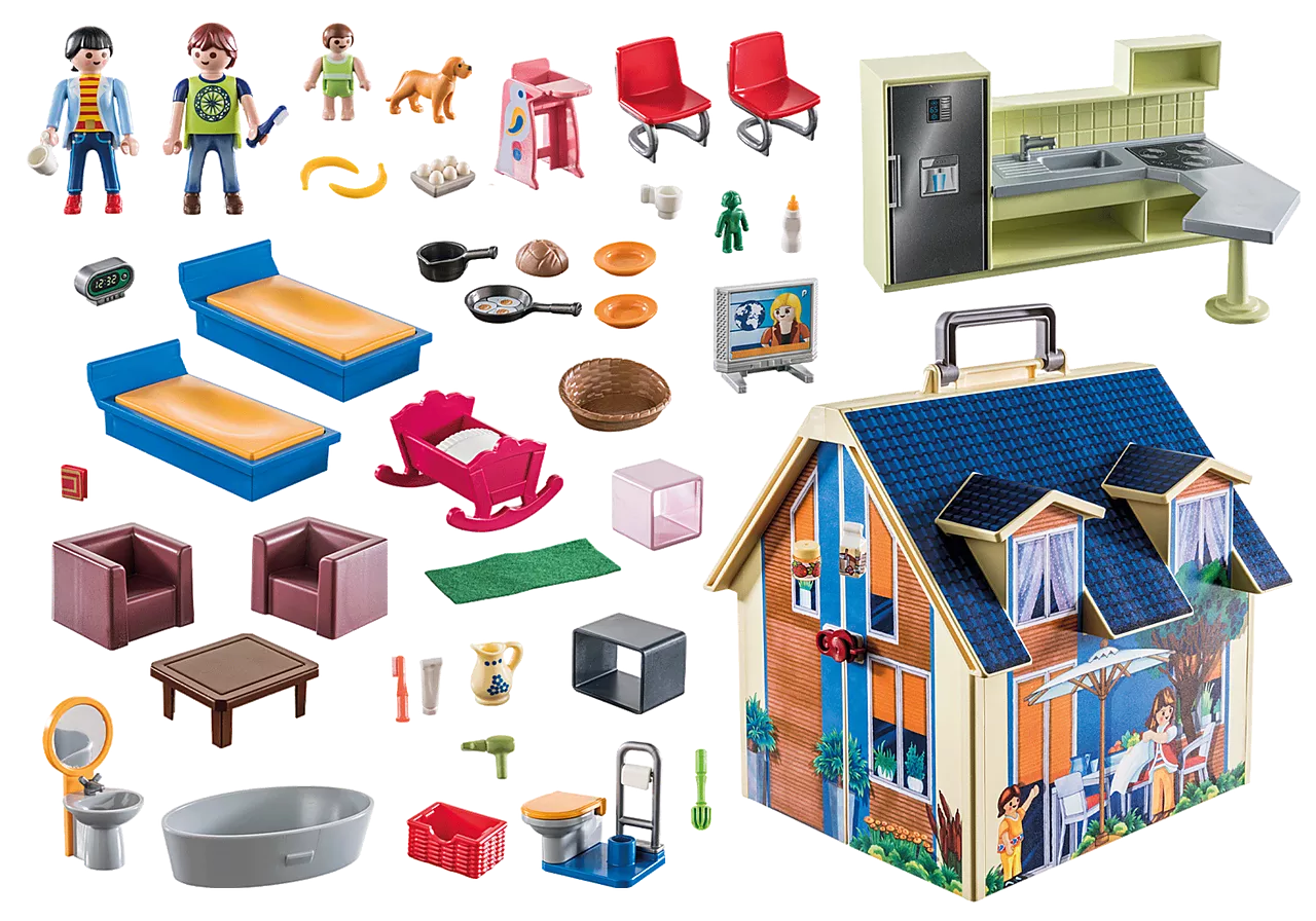 Figures: 1 woman, 1 man, 1 baby; animals: 1 dog puppy; accessories: 1 take-home dollhouse, 2 armchairs, 1 TV set, 1 shelf, 1 coffee table, 2 beds, 1 shelf, 1 book, 1 basket, 1 box, 1 cradle, 1 clock radio, 1 doll, 1 baby bottle, 1 high chair, 2 chairs, 1 kitchen table, 1 fridge, 1 dishwasher, 2 cups, 2 plates, 1 pot, 1 pan, 1 saucepan, 1 pack of eggs, 1 banana, 1 jam jar, 1 bathtub, 1 toilet, 1 sink with mirror, 1 towel, 1 basket