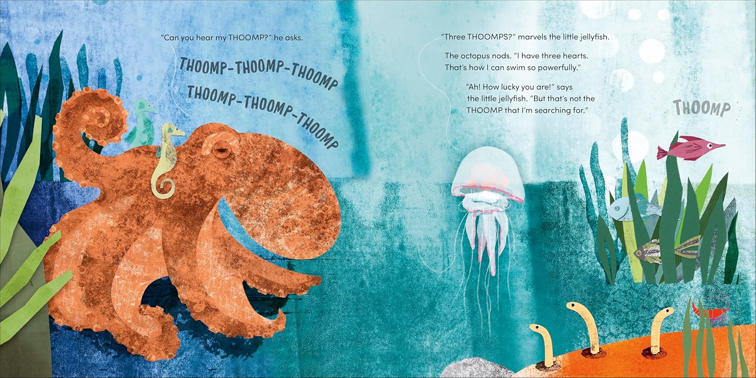 In the depths of the sea, a jellyfish hears a loud THOOMP. What is this mysterious sound? A wise fish explains that the THOOMP is a heartbeat. The jellyfish listens to the wise fish's soft heartbeat but sadly realizes she has no heartbeat herself, so she swims off to search for it. Along the way, she meets various creatures and learns about their heartbeats, from the seal to the whale to the octopus with three hearts! But why can't she hear her own?