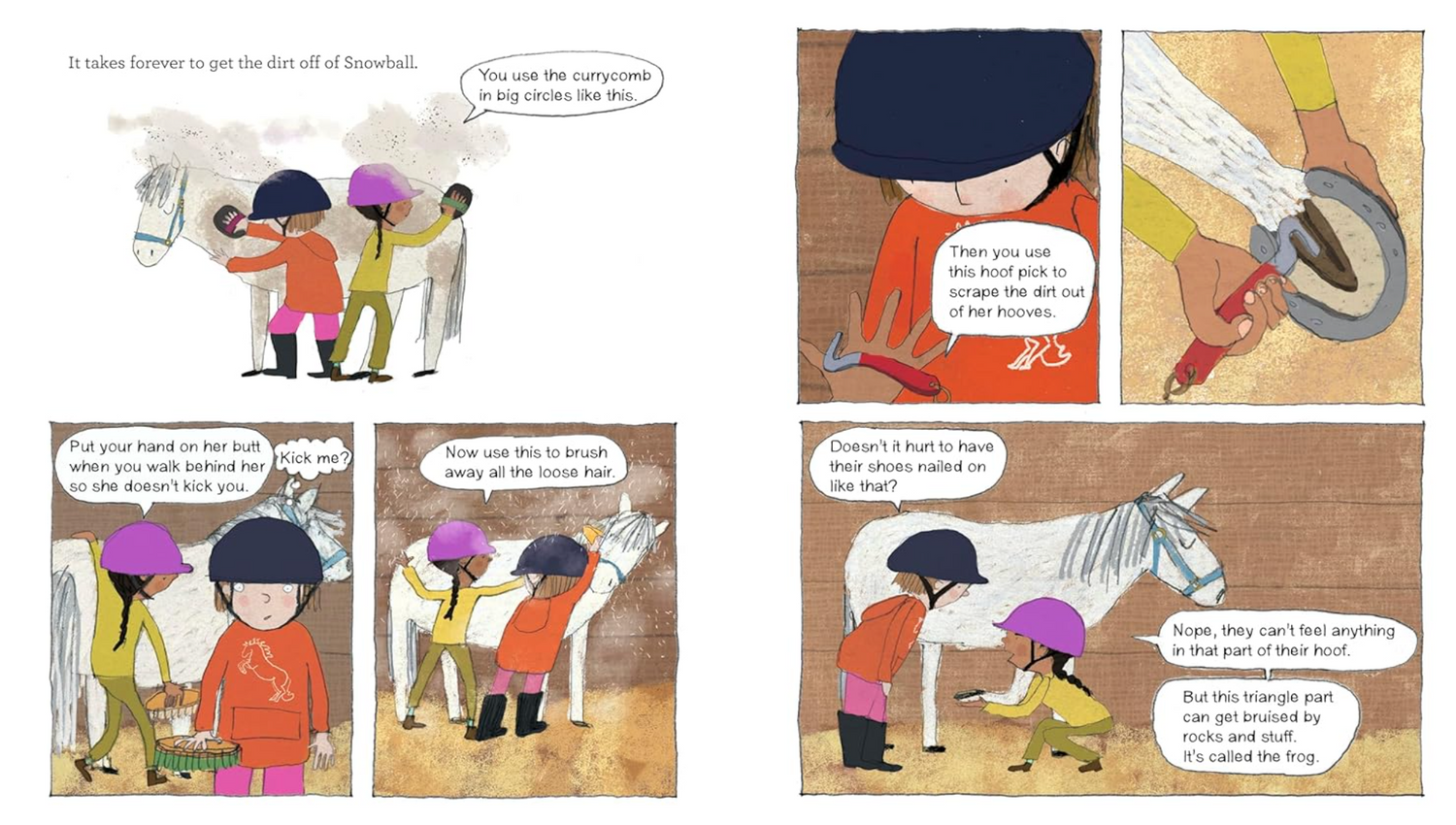 Frances adores horses and knows everything about them—at least she thinks she does. But when she arrives at her friend Mae’s house for her first horseback-riding lesson sporting a bike helmet and rain boots, Frances quickly discovers that she might not know as much as she thought she did. Barns are actually a little stinky, and it takes a lot of time to brush a horse and tack it up (what does that even mean?). Not to mention that horses are much bigger in real life, and being so far off the ground can be a little scary! Will Frances be brave enough to ride Snowball all by herself, or will it be too different from what she’s imagined?