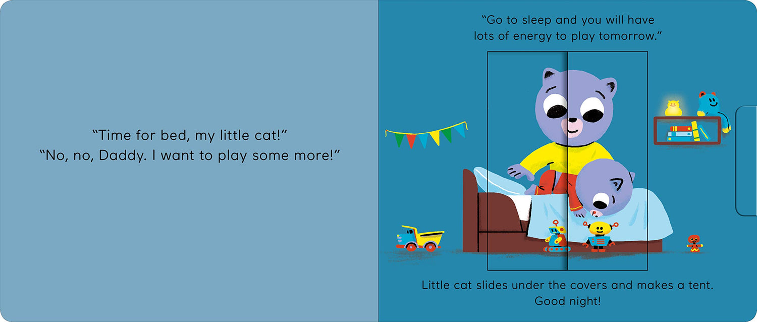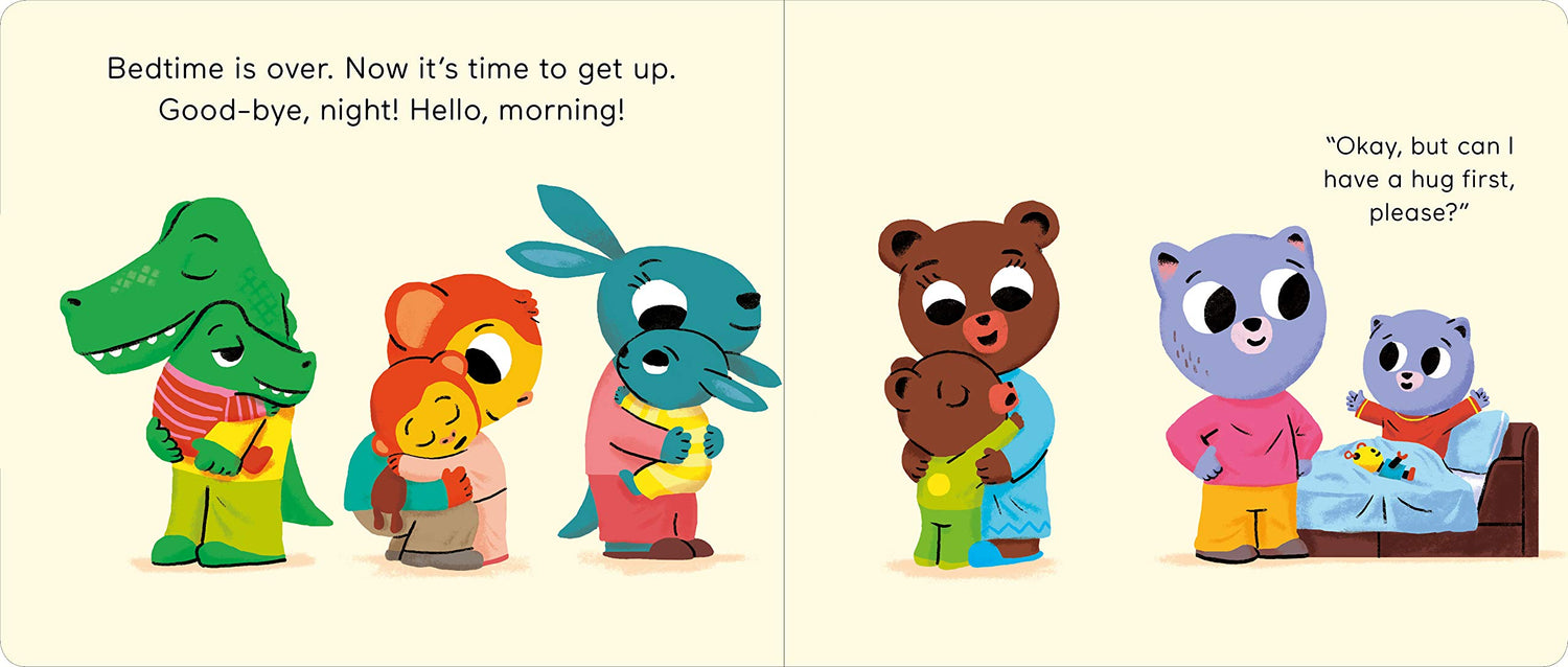 It's bedtime, but five animal friends just can't seem to fall asleep. Little crocodile wants one last hug, Little monkey feels it's too dark, and Little cat just wants to play some more. With patience and understanding, their moms and dads know just how to soothe their children, and provide the comfort that eventually sends them off to sleep. Young children will enjoy pulling the tabs to change the pictures on every spread, to see just how the little animals are reassured. Illustrated by Bedouet Thierry. Board book. Suggested ages 3-5.
