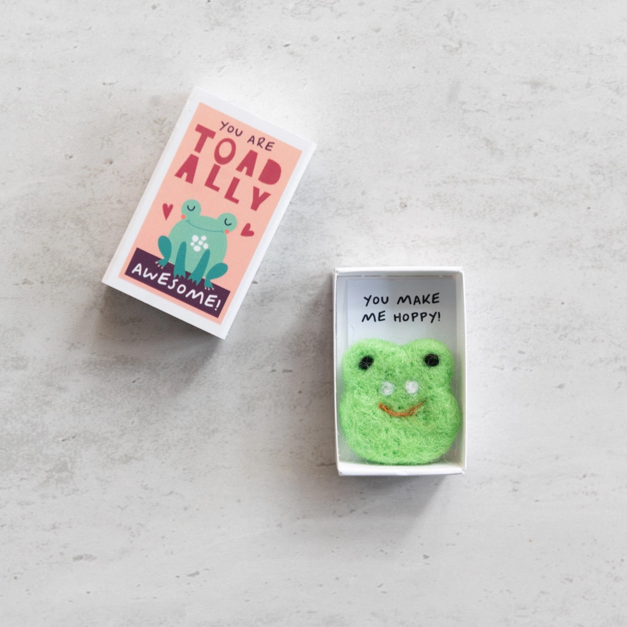 Show them how special they are, with this beautiful hand made wool felt frog in a matchbox. This cute matchbox with the message ‘You are TOADALLY AWESOME’, is a perfect gift for a loved one, to let them know how much they mean to you. Open the matchbox to reveal a gorgeous handmade wool felt frog, and the message ‘You Make Me Hoppy!’ This delightful gift is guaranteed to put a big froggy smile on their face!