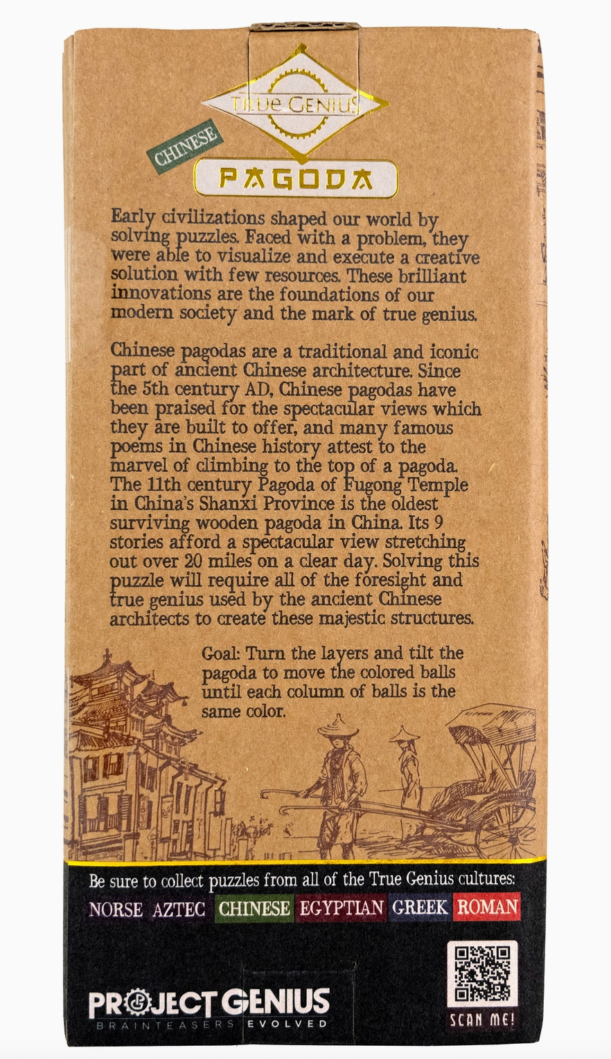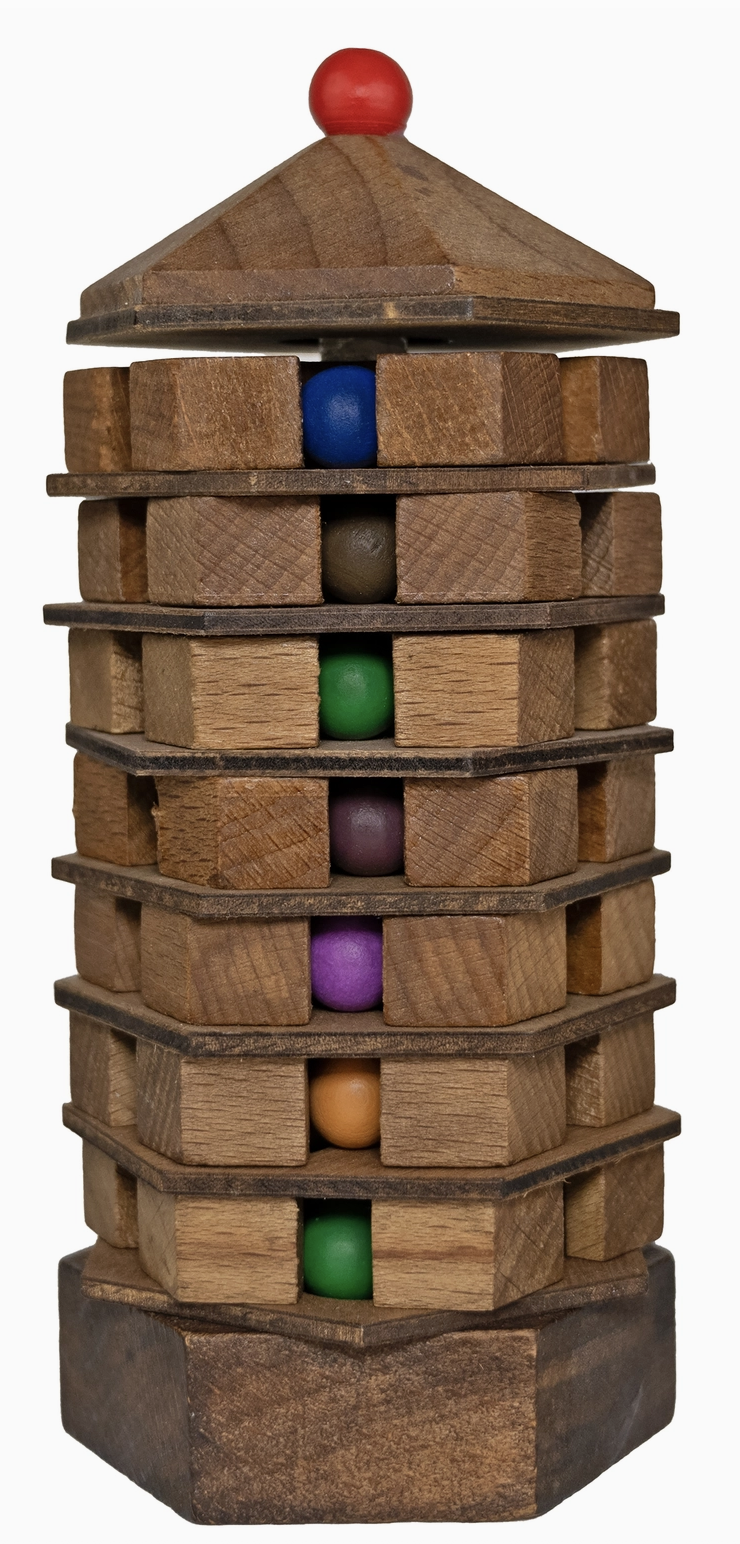 Scramble the colors on the layered pagoda by moving one ball at a time from one tier to another, and then once it is scrambled, solve the puzzle by getting all the colors lined up in columns again!